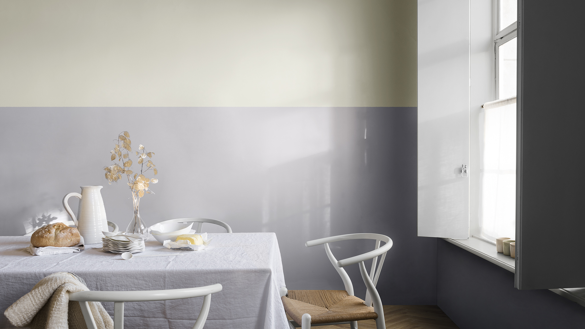 Có được vẻ ngoài quyến rũ, phá cách bằng cách kết hợp Màu sắc của năm 2020, Xanh Denim kết hợp với một màu kem sang trọng. Những tông màu này phối hợp đẹp mắt để tạo ra một không gian hài hòa. Hiệu ứng phân chia mở rộng diện mạo của căn phòng cho một không gian mở phù hợp cho bữa ăn cùng với những người thân yêu. Mọi thứ sẽ trở nên hoàn hảo hơn khi kết hợp cùng với một chiếc khăn trải bàn bằng vải lanh mới cùng các vật liệu mộc mạc để tạo cảm gián thật thoải mái.